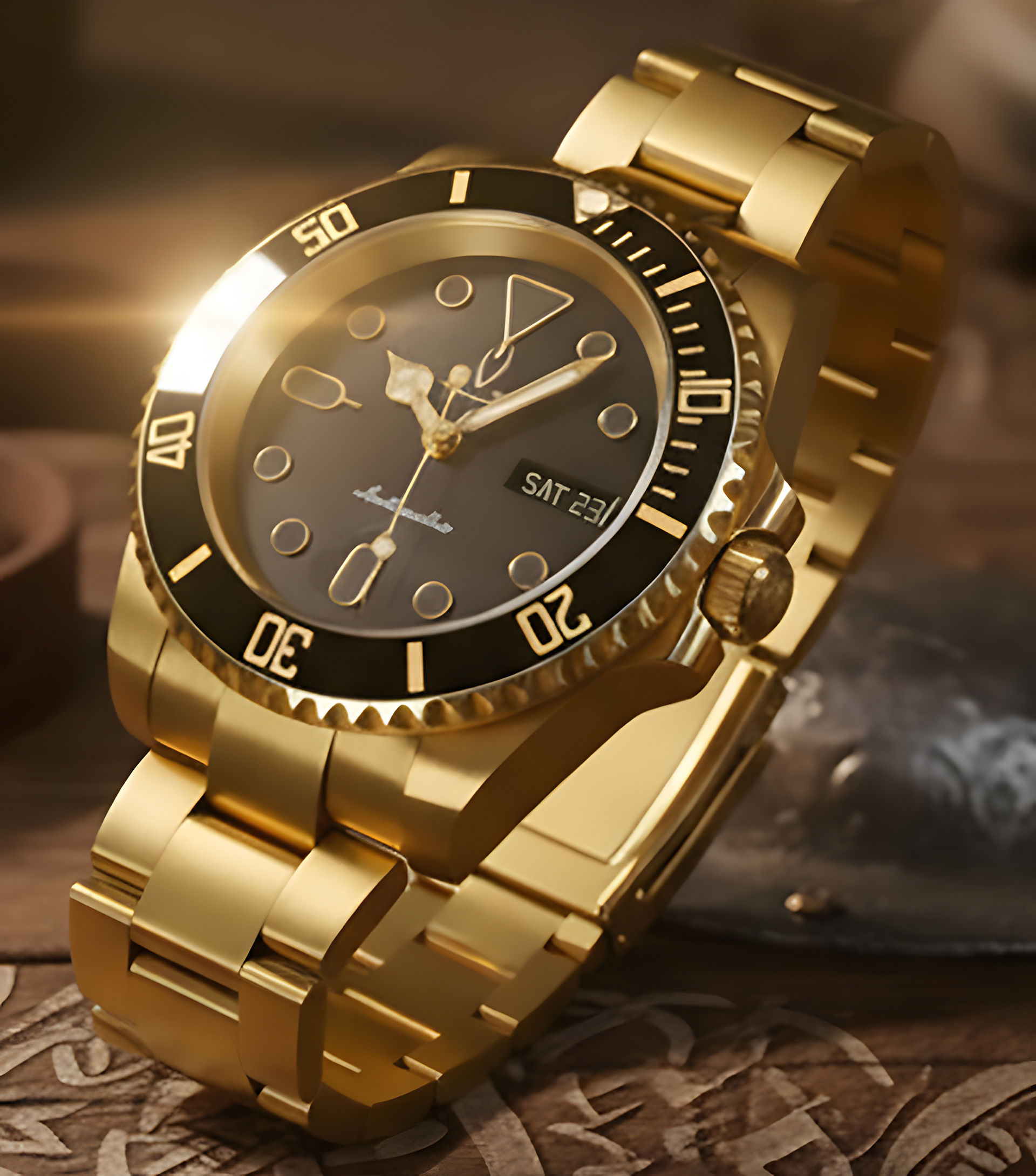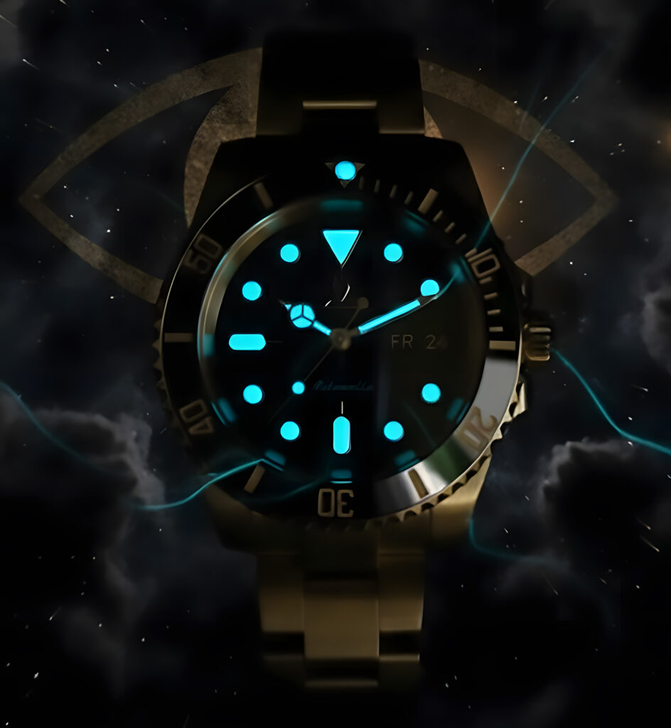- Gyldne og hvide time- og minutvisere med blå selvlysende effekt